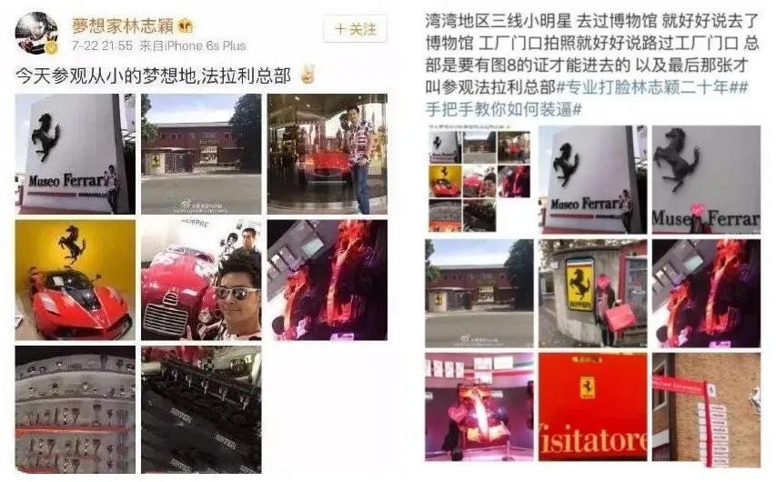 微博曬的豪車圖,是盜的網圖;發博稱和車神舒馬赫合拍雜誌,也是P的;去法拉利博物館,要吹成去參觀法拉利總部,被網友在線打假……