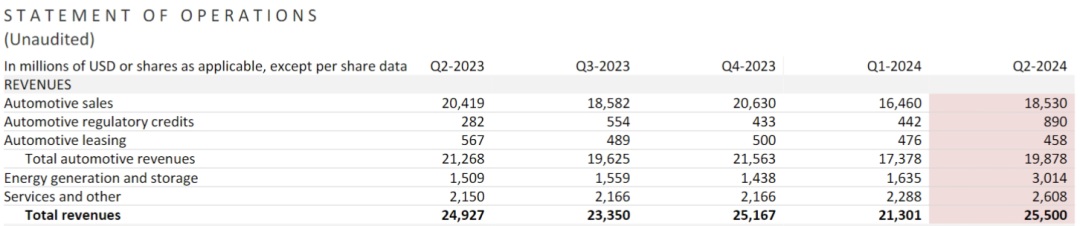 在一季度收入出現 8.7% 的下滑後,特斯拉本季度收入實現扭轉,重回增長。二季度收入達到 255 億美元,同比增長 2.3%,其中汽車業務收入下滑,但能源生產和儲存,以及服務( 售後保養、保險等 )收入增長。