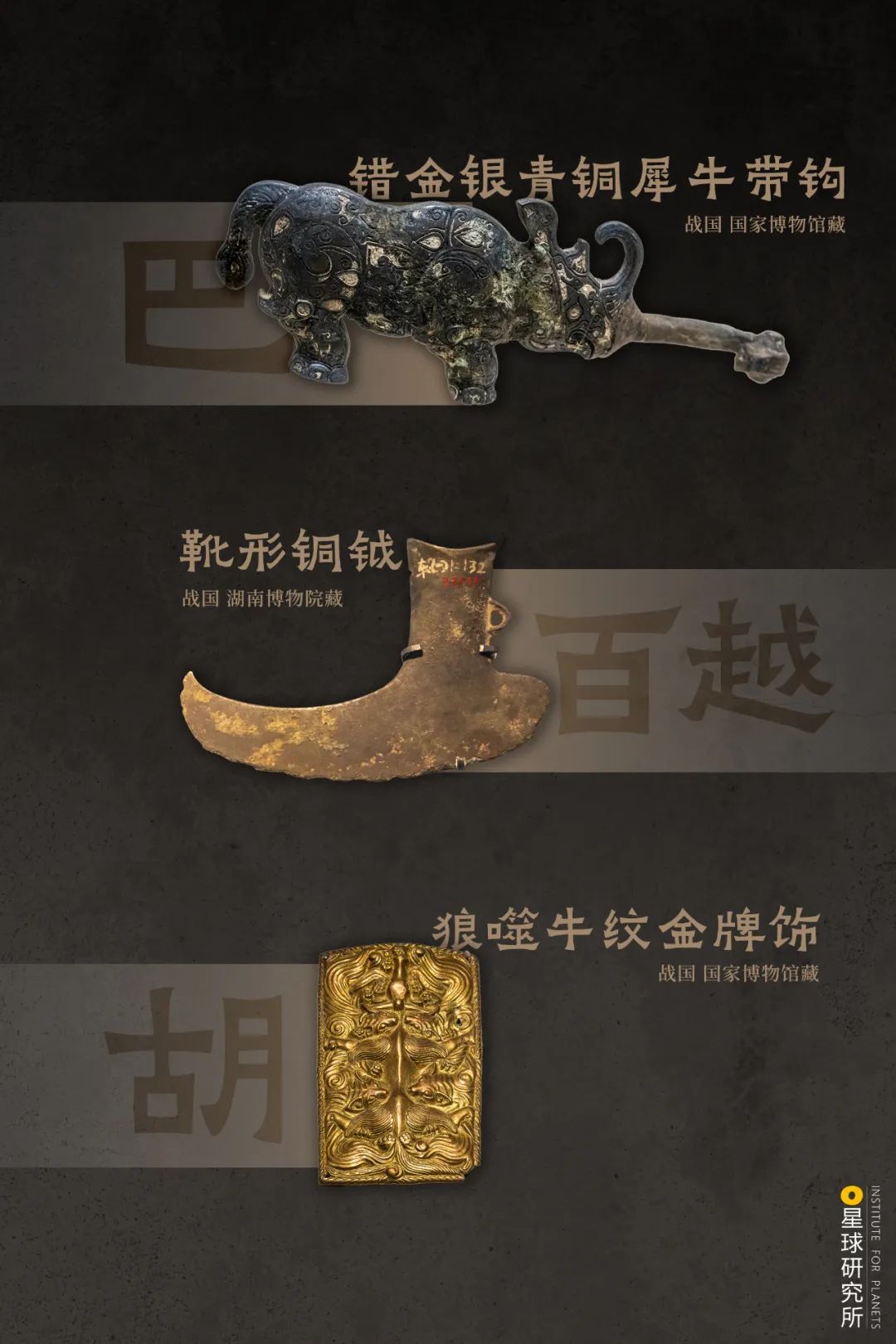 (錯金銀犀牛銅帶鈎、靴形銅鉞、狼噬牛紋金牌飾,圖片源自@視覺中國、龍世傑、秦南,製圖@梯田/星球研究所)