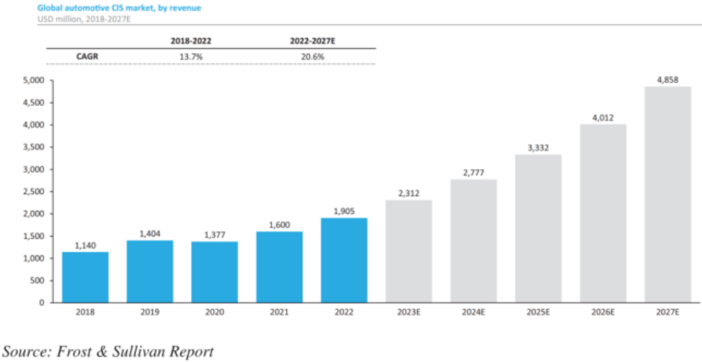 在此背景下,前裝市場已經成為汽車CIS的增長主力。根據Frost&Sullivan的數據,全球汽車CIS市場預計到2027年將達到48.58億美元,複合年均增長率約為20.6%。