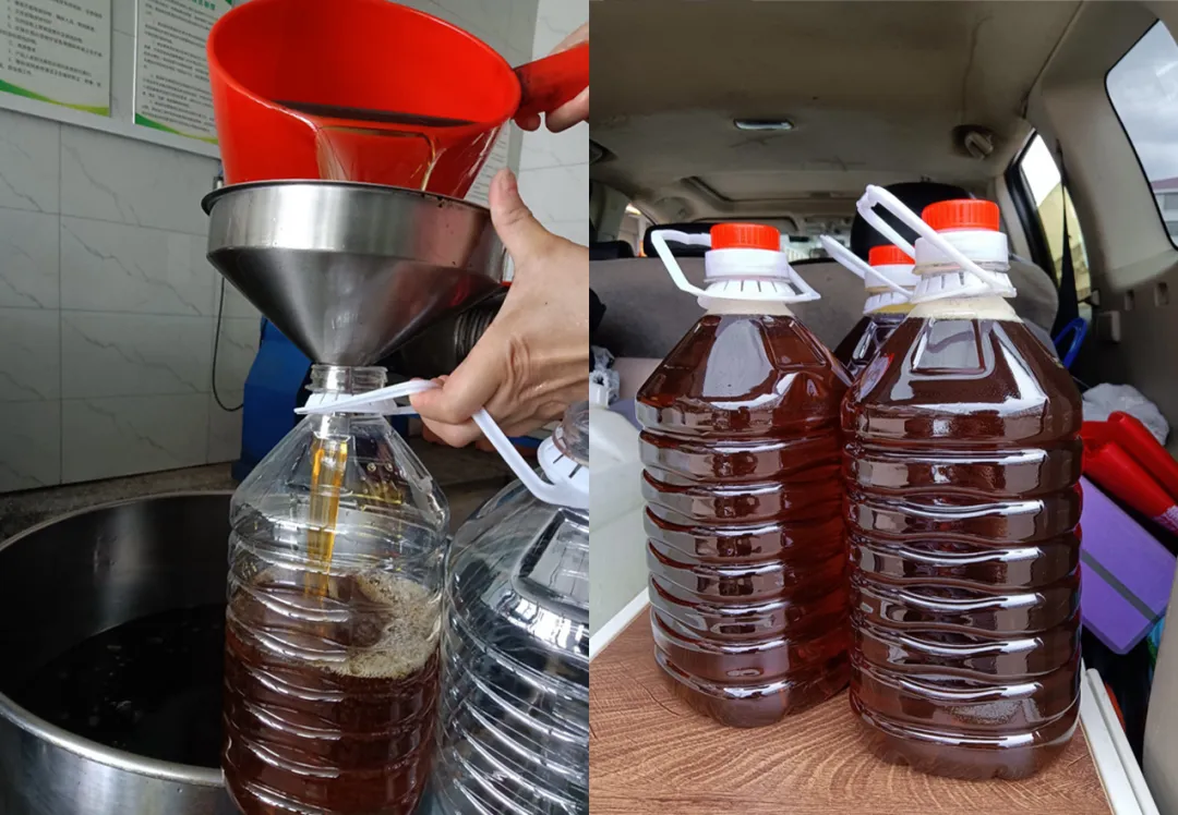 劉航在湖南長沙工作,老家在120公里外的瀏陽市大圍山鎮。**他已經暫停吃超市的桶裝油了。**最近他開車回老家,順便在當地一個榨油小作坊買了15斤油,其中10斤是外地山茶籽榨的山茶油,50元一斤;5斤是菜籽油,10元一斤。