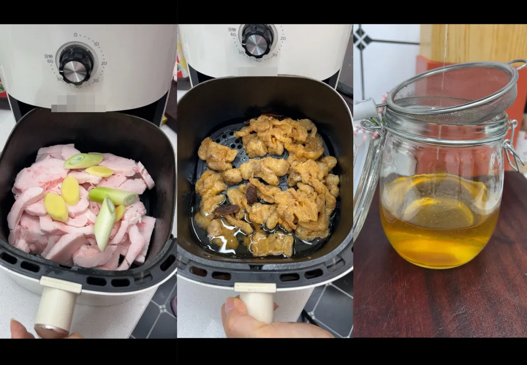用鐵鍋土法煉油已經是常規操作了。7月13日,山東濰坊的美食博主王杉杉在網上發佈了一個新方法——用空氣炸鍋煉豬油。