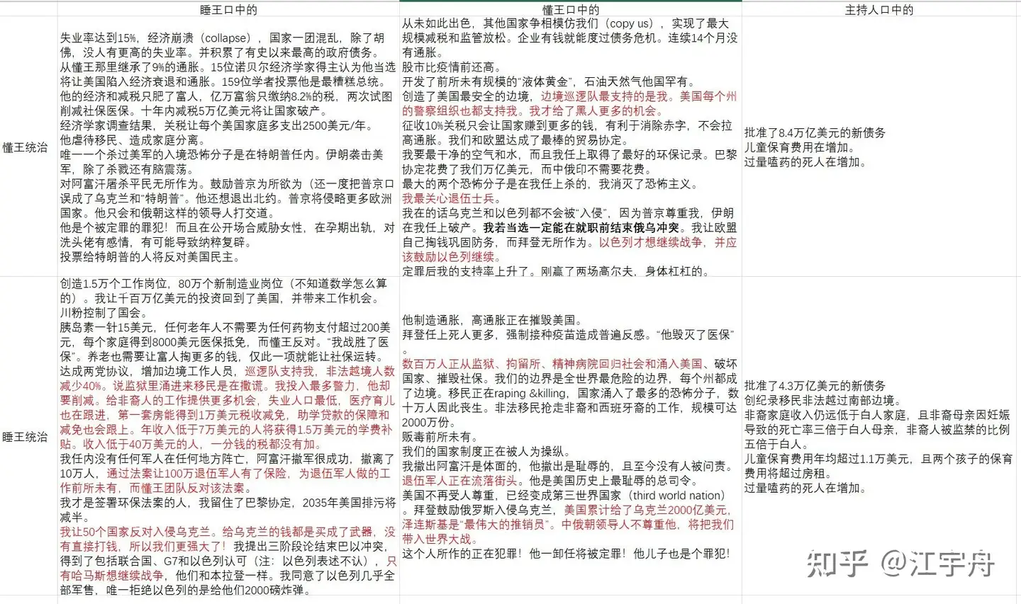 這是當時整理的、剔除了墮胎一類虛幻政治正確後的雙方議題內容,話題質量可想而知。如果還是看不清字,可以轉該鏈接:如何評價 2024 年特朗普和拜登的首場電視辯論,與 4 年前相比有哪些變化,本次雙方表現如何? - 知乎 (zhihu.com)