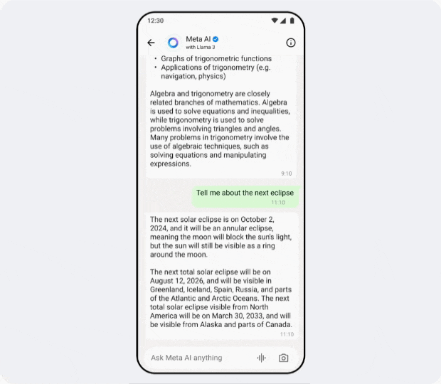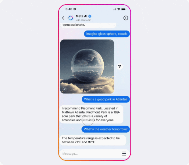Llama 3.1 現在為 Meta AI 提供支持,Meta AI 是 Meta 應用程序和雷朋智能眼鏡中提供的 AI 助手,它被定位為像 ChatGPT 這樣的通用聊天機器人,幾乎可以在 Instagram、Facebook 和 WhatsApp 的任何地方找到。