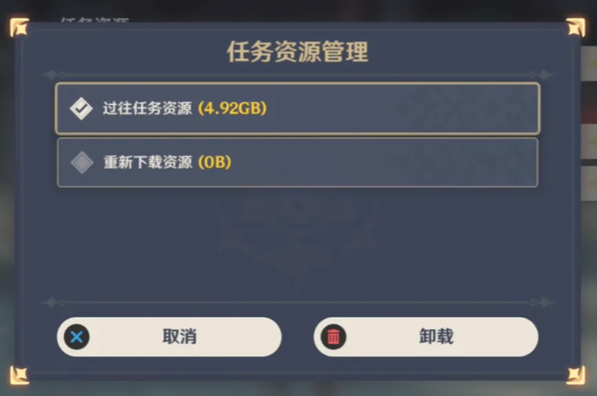 要利用好有限內存的第一步,是去除一切相對無用資源的佔用,比如對於不聲控也不看劇情的我來説,在可選資源包下載的遊戲裏,只要不是需要強制下載且影響基礎遊戲體驗的資源,通通取消勾選。