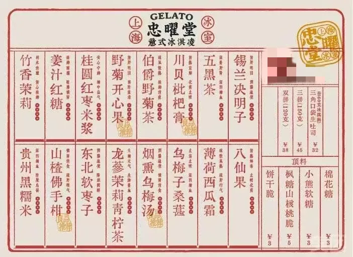 菜單顯示,店內的冰淇淋口味有16種,每種冰淇淋都融入了中藥草本元素,並標註出草本功效,如“桂圓紅棗米漿”能安心寧神、“八仙果”能止痰化咳、“龍參茉莉青檸茶”能大補元氣等。