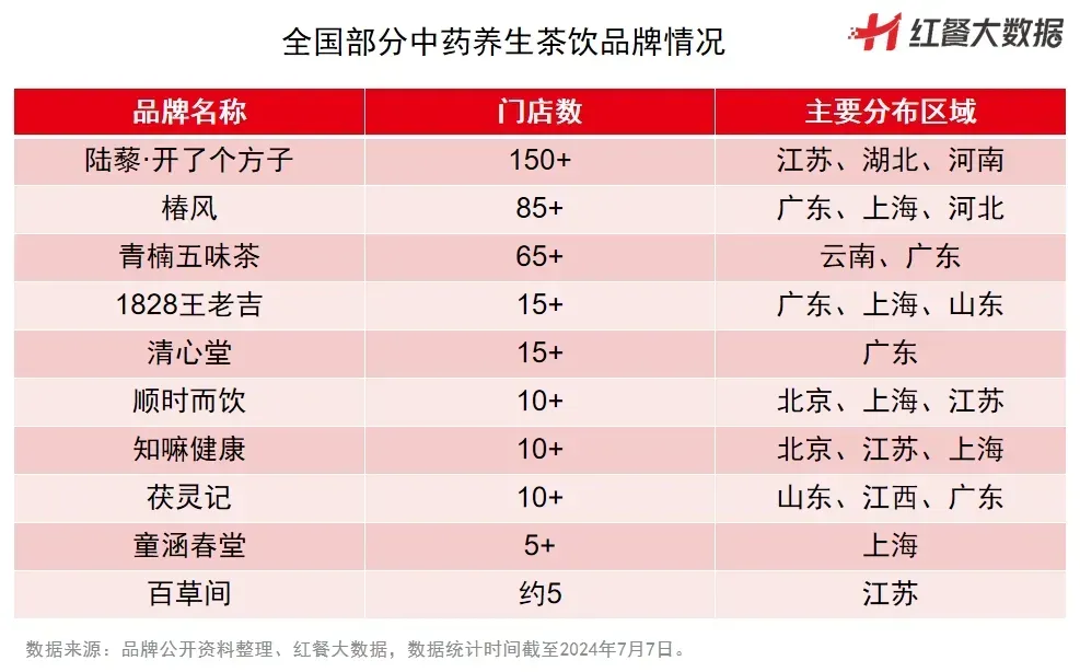 其中又以中藥茶飲最常見。據紅餐網不完全統計,全國已有超30個主打中藥或草本養生的茶飲品牌,如陸藜·開了個方子、青楠五味茶、椿風、知嘛健康、百草間等,有的品牌已在一線、二線城市開出了上百家門店。