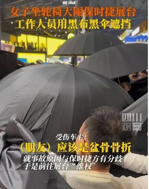 比如還有一位疑似車出事故,坐着輪椅車展維權的上帝,還沒到場,就被警覺的黑傘大漢,關進了小黑屋。