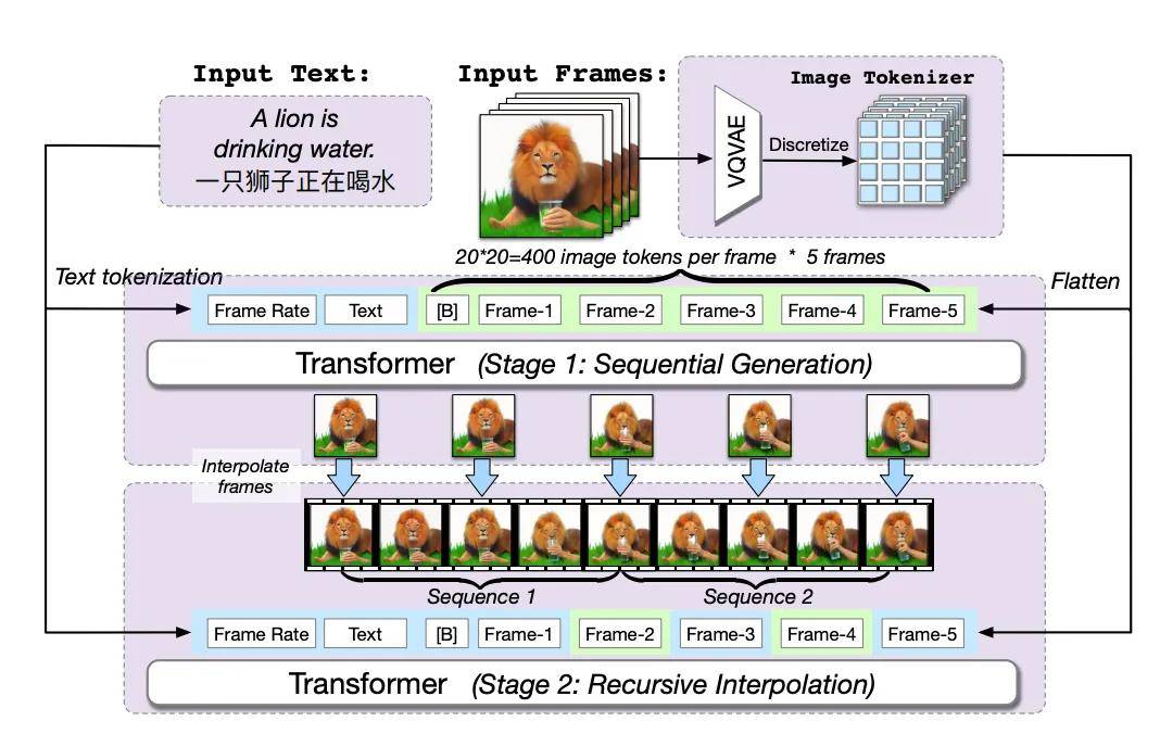 比如CogVideo採用的多幀率分層訓練策略,提出了一種基於遞歸插值的方法,即逐步生成與每個子描述相對應的視頻片段,並將這些視頻片段逐層插值得到最終的視頻片段,賦予了CogVideo控制生成過程中變化強度的能力,有助於更好地對齊文本和視頻語義,實現了從文本到視頻的高效轉換。