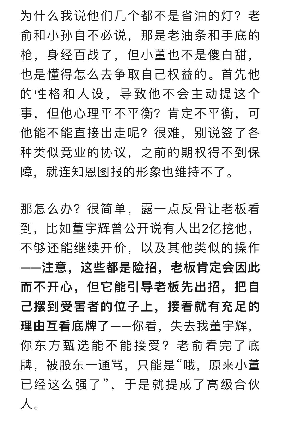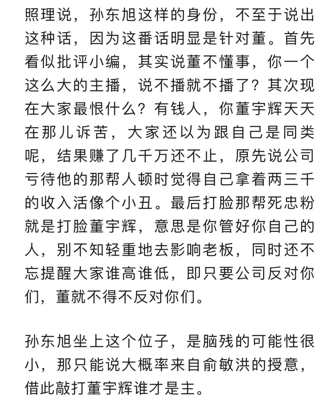 小作文並不是一個偶然事件,當公司裏有人的貢獻比例和不可替代性大到了一定程度,卻沒有收到相對應的回報時,矛盾就會一點一滴地累積,**這不是喝幾頓酒,説“宇輝是我兄弟”就能解決的。**一開始肯定是內部互相揶揄,相互排擠,這叫內部對抗,後來俞老闆派小孫祭出小作文,董宇輝也多次公開説自己壓力大,抗拒賣貨,不想播了,還説有人出幾個億挖他但他沒去等等,就是雙方互相亮劍的階段了。為什麼亮劍,為了陽春白雪亮劍?肯定是為了利益啊。