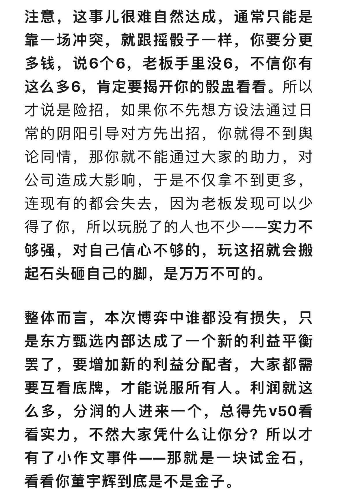 小作文並不是一個偶然事件,當公司裏有人的貢獻比例和不可替代性大到了一定程度,卻沒有收到相對應的回報時,矛盾就會一點一滴地累積,**這不是喝幾頓酒,説“宇輝是我兄弟”就能解決的。**一開始肯定是內部互相揶揄,相互排擠,這叫內部對抗,後來俞老闆派小孫祭出小作文,董宇輝也多次公開説自己壓力大,抗拒賣貨,不想播了,還説有人出幾個億挖他但他沒去等等,就是雙方互相亮劍的階段了。為什麼亮劍,為了陽春白雪亮劍?肯定是為了利益啊。