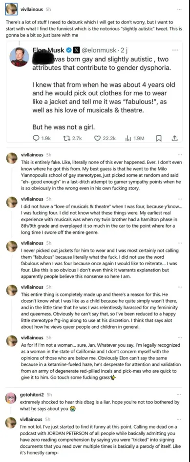 在馬斯克的眼裏,薇薇安是一個:出生時候是一個患有輕微自閉症的同性戀,四歲的時候幫馬斯克挑選夾克,且喜歡音樂劇和戲劇。