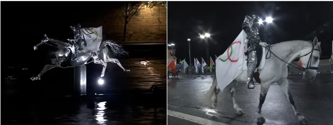 五環旗最後從塞納河送往主會場,這段路也是由一位女騎士騎馬完成的,非常酷!先是在河上乘船騎鐵馬,到了主會場後騎白馬,超級颯!