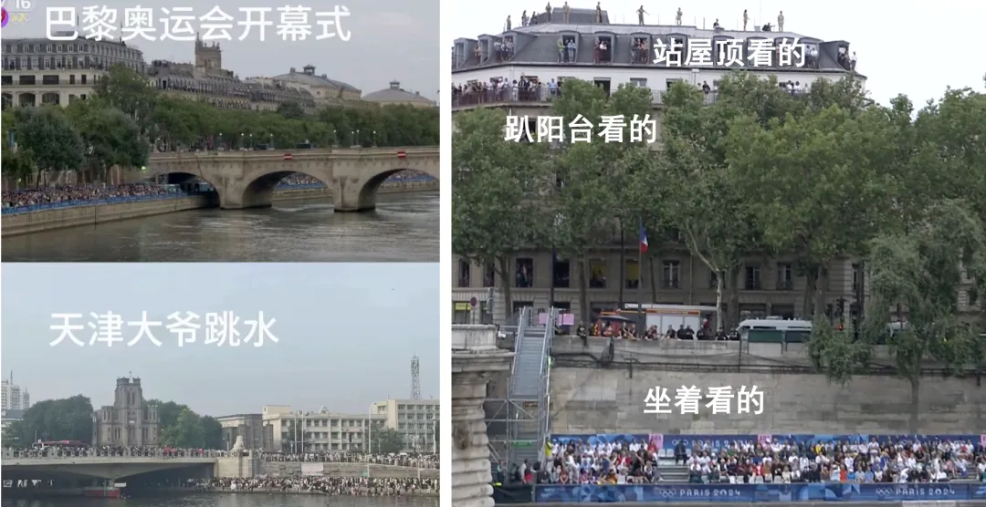 開幕式時,鏡頭給到法國民眾,畫面也充滿着像看天津大爺跳水一般的鬆弛感。一眼看過去,趴陽台看的,叉腰站屋頂看的,很愜意。