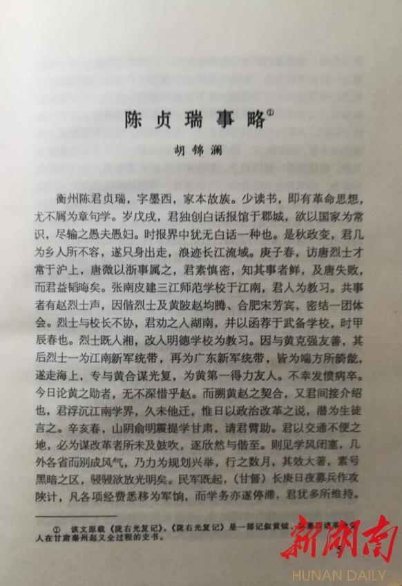 民國元年胡錦瀾先生撰寫的《陳貞瑞事略》