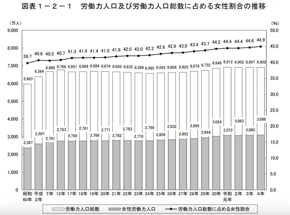 從1985年到2022年,日本勞動人口中的女性比例從39.7%攀升到了44.9%,男女間的薪資差異也逐年縮小。