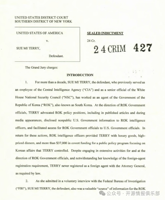 特里在2023年6月接受美國聯邦調查局的自願採訪時承認,她是韓國情報部門的“消息來源”,“這意味着她提供了有價值的信息”。