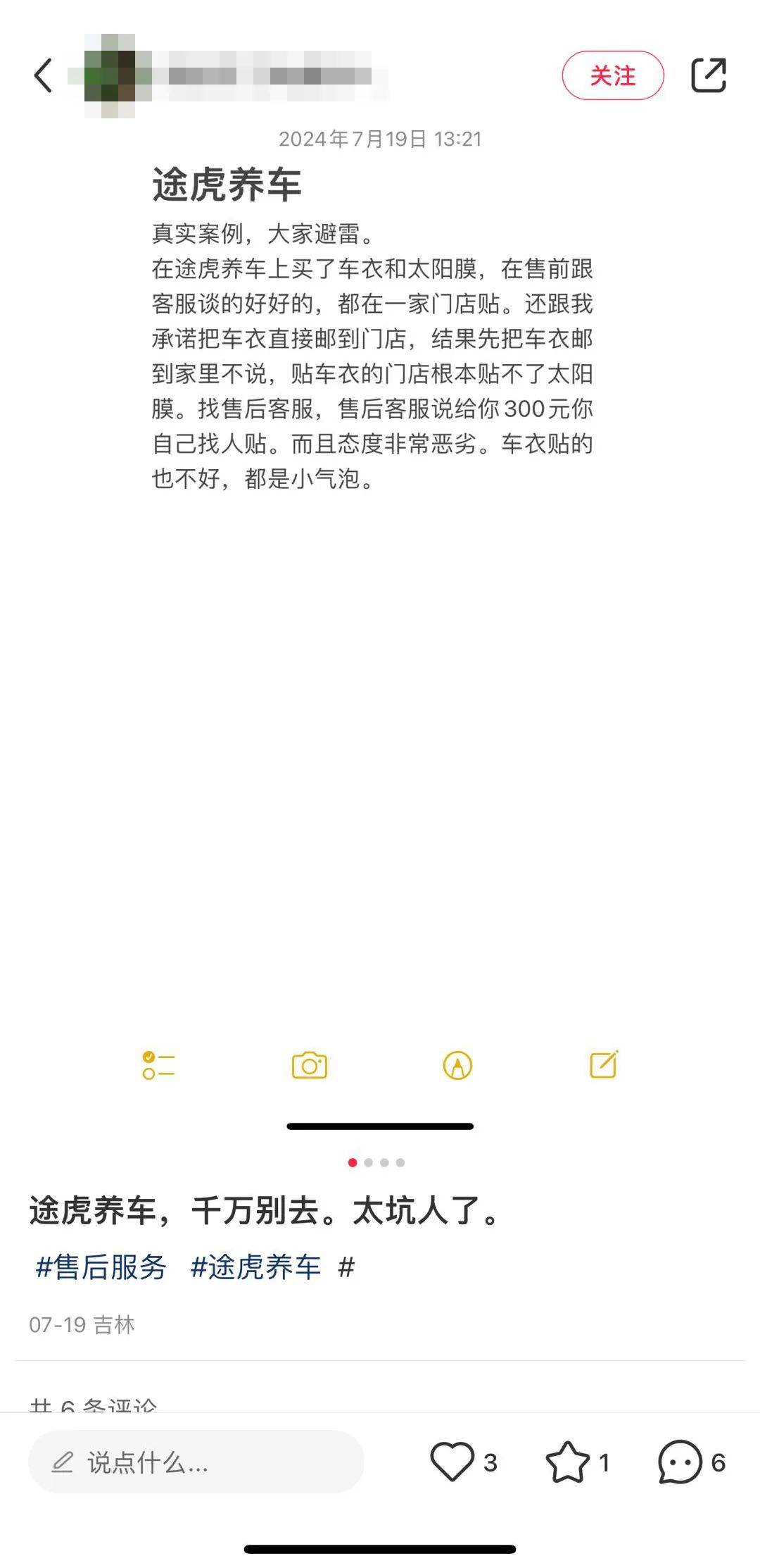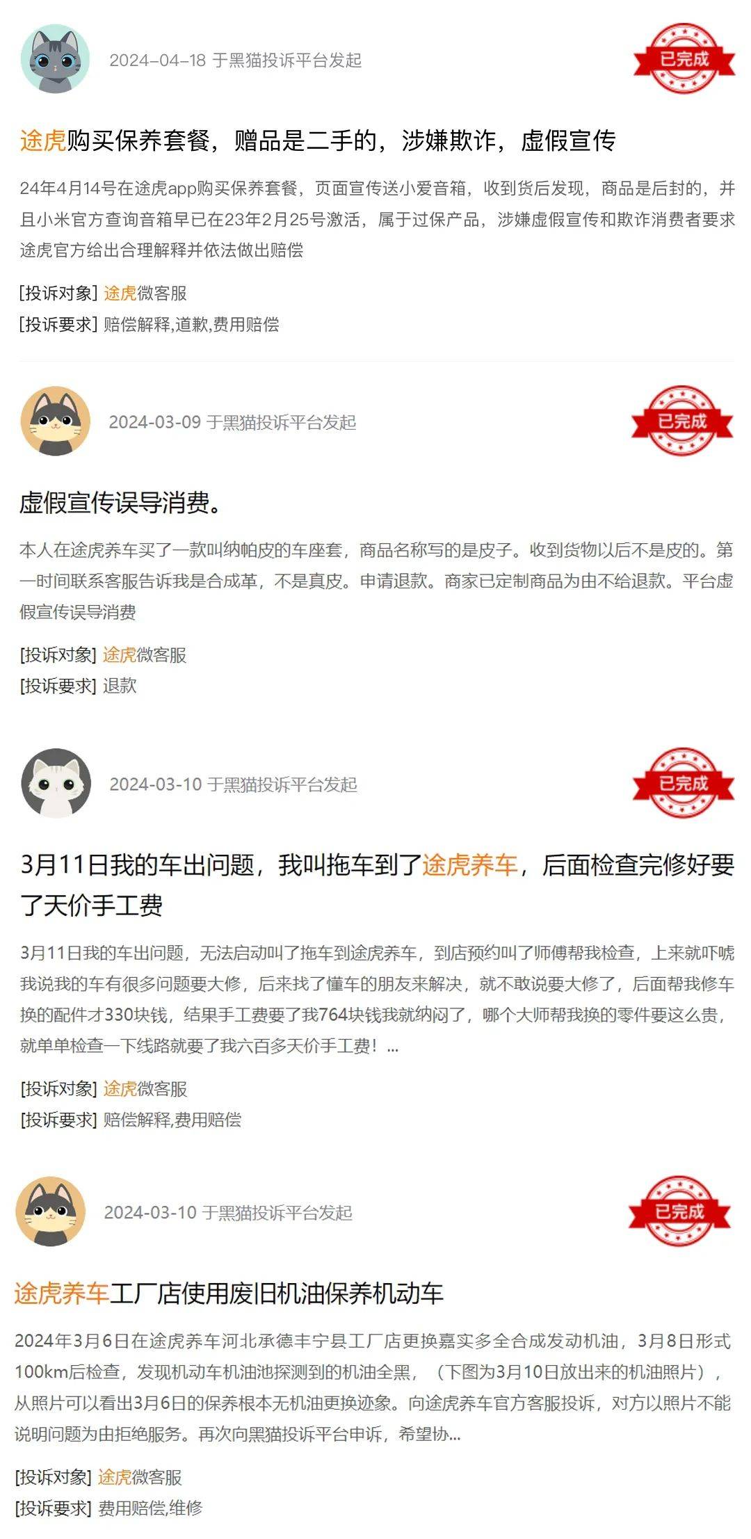 張力所經歷的場景,並非個例。據「探客出行」查詢黑貓投訴、小紅書等平台發現,有用户針對途虎養車發表虛假宣傳、以次充好、價格虛高等評價。
