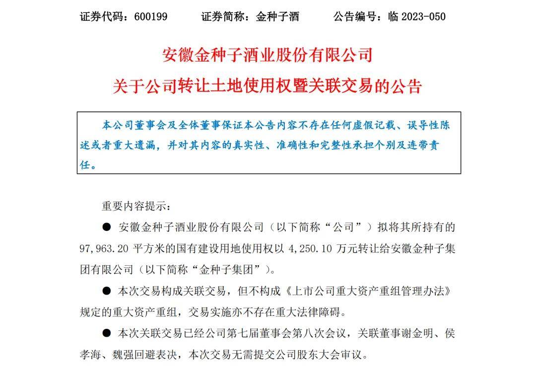 2023年12月,金種子還曾公告,將其所持有的9.8萬平方米的國有建設用地使用權以4250.01萬元轉讓給控股股東安徽金種子集團有限公司。