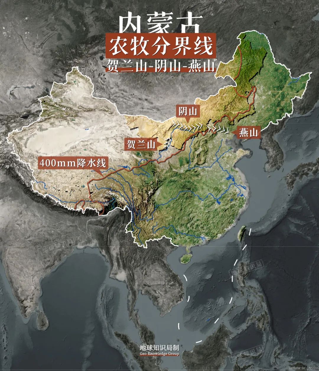 800mm線,是我國大致的南北降水分界線,也是所謂“水旱田分界線”;而400mm線,是我國的農牧分界線,高於400mm就能種旱田,內蒙古的赤峯、通遼很多地方低於400mm,靠徑流和地下水也能勉強種田。
