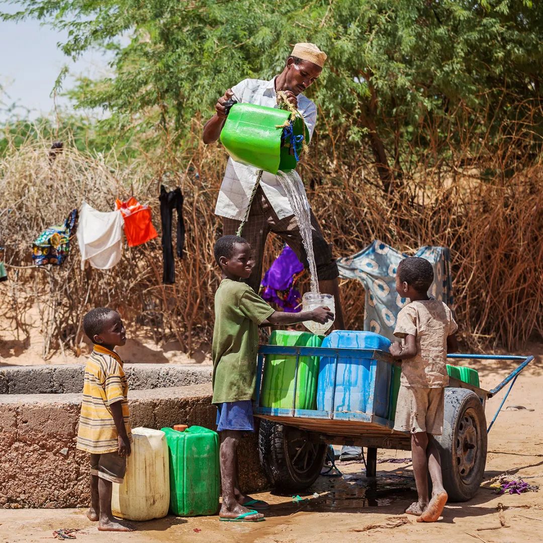 尼日爾人在沙漠綠洲的公共水井邊往塑料容器裏裝水