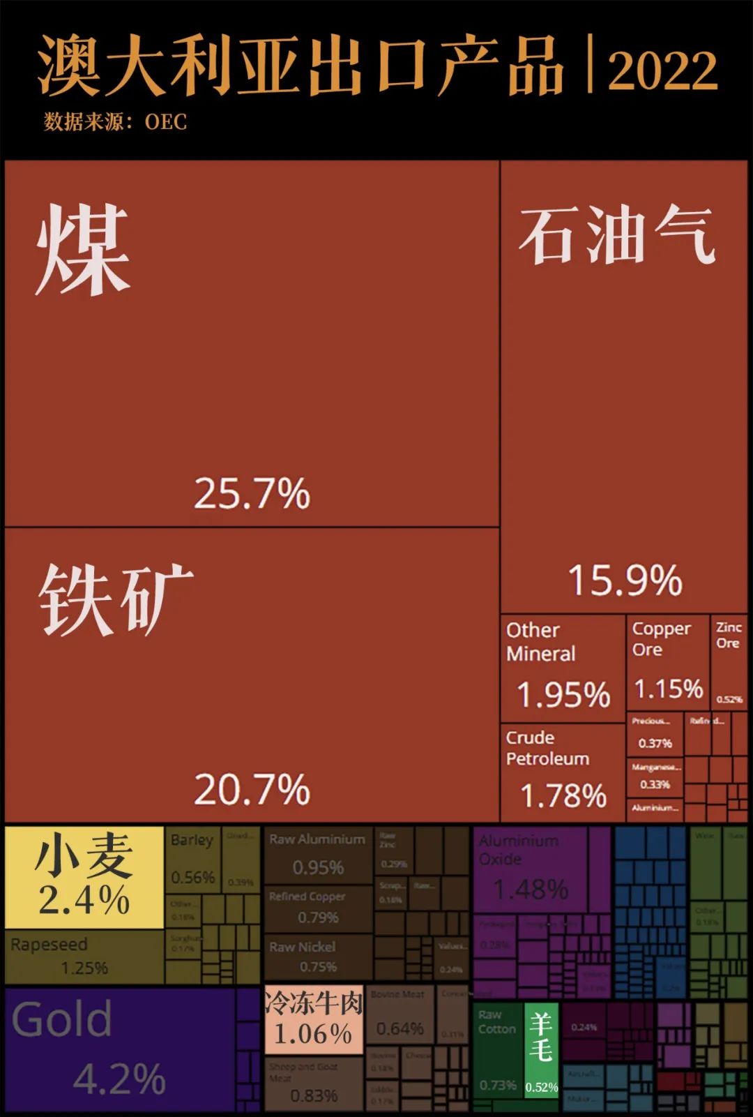 翻開澳大利亞2022年的“出口菜單”,佔比三分之二的各種礦大都賣給了東亞三國。而排在礦產後面的,就是農牧產品,其小麥出口世界第3,羊毛世界第1,冷凍牛肉世界第3,中國也是其中的大買家。