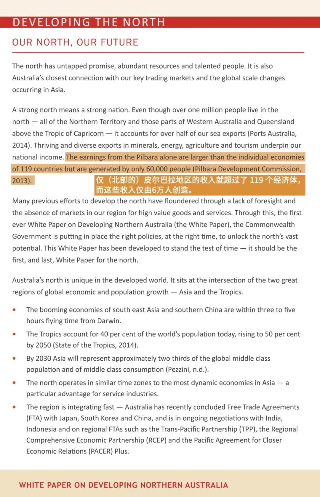 在澳大利亞發佈的《我們的北方,我們的未來:發展澳大利亞北部白皮書》裏就提到:“僅(北部的)皮爾巴拉地區的收入就超過了119個經濟體,而這些收入僅由6萬人創造。”