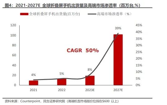 另據市場調研機構Counterpoint預測,全球摺疊屏手機出貨量將從2022年的1310萬台增至2027年的1億台,CAGR(複合年均增長率)達50.2%,預計2027年在高端市場滲透率達39%。