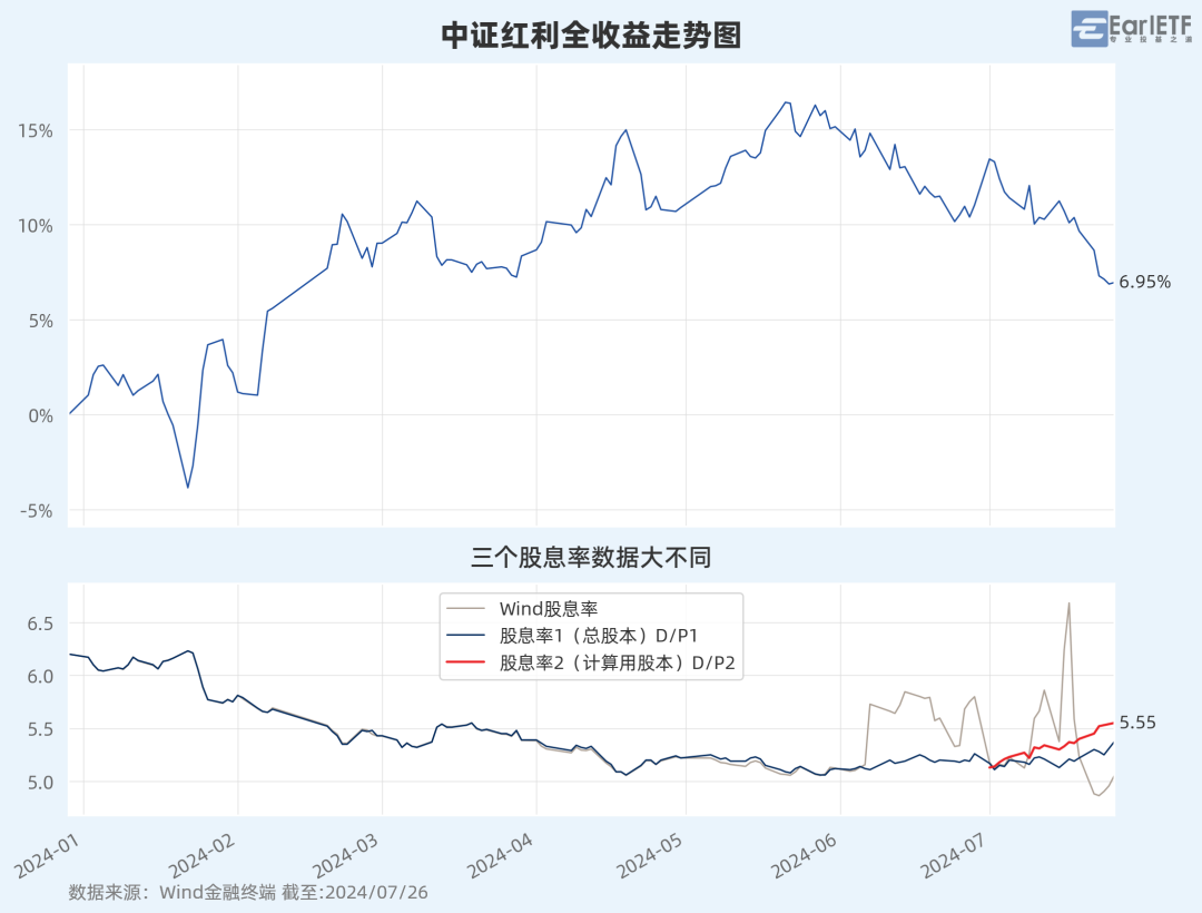 其中紅色的那根,就是比較公允的股息率 2 數據,可以看到截至 7 月 26 日的最新股息率是 5.55%——而在7 月初,卻只有5.13%。顯然,近期中證紅利指數的回調,顯著提升了股息率。所以紅利投資者不用擔心指數和股息率同跌的情況了。