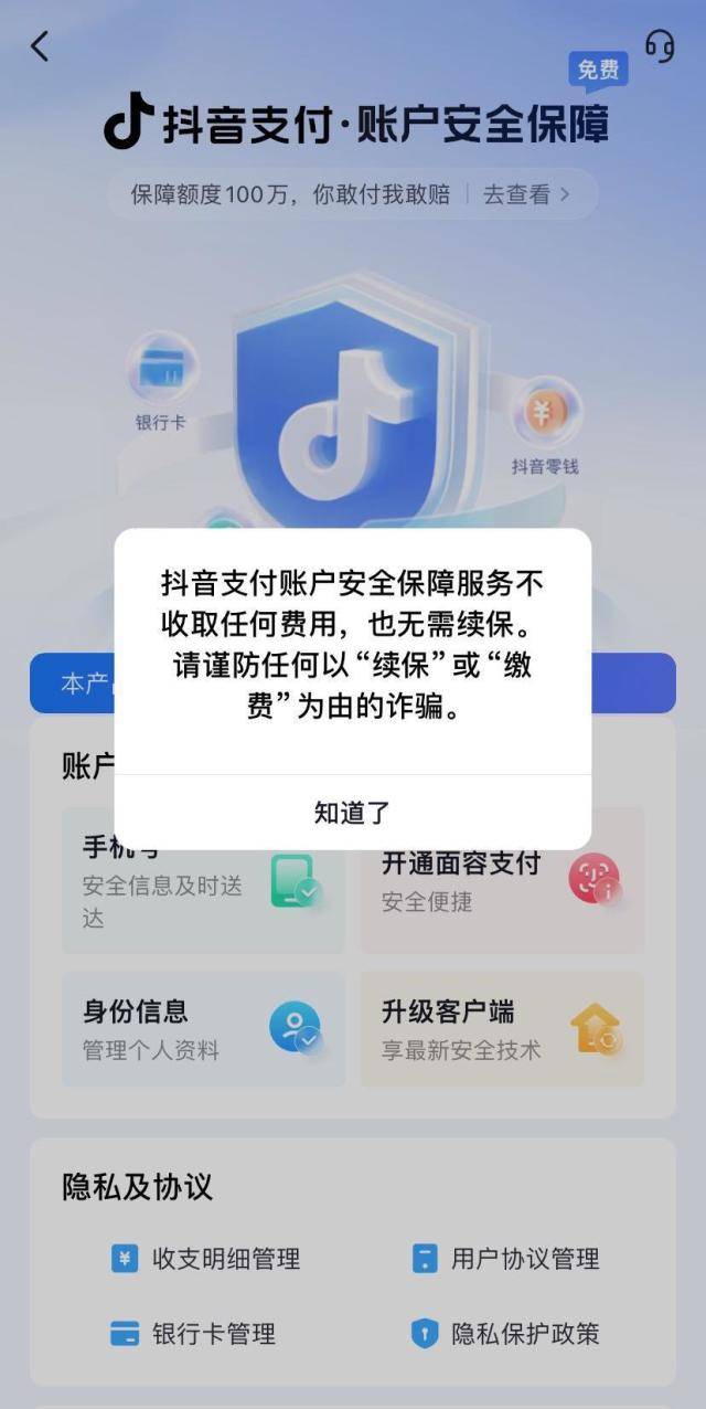 抖音安全中心相關人員表示,上述騙局實際上是假冒抖音支付推出的“百萬保障”的名義來施行詐騙。早在2021年4月,抖音支付聯合中國人保財險,為用户免費提供一項賬户安全保障,用户的抖音支付(包含零錢、銀行卡、抖音月付)賬户如果被他人盜用而產生資金損失,平台承諾按損失金額不限次賠付,每年賠付金額累計最高100萬元(俗稱“百萬保障”)。該項保障不收取用户任何費用,也無需續保,長期有效。