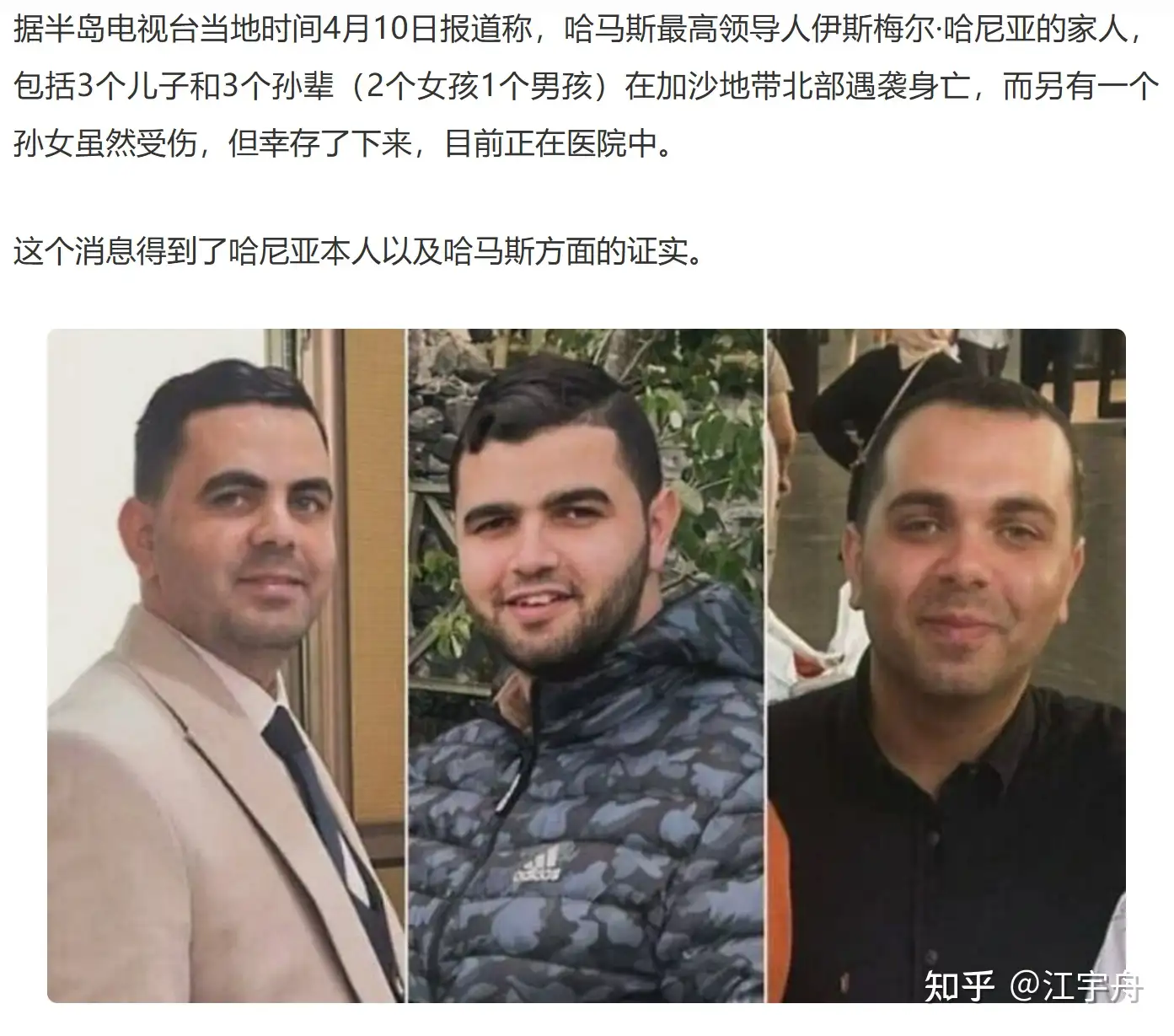 1、從最新新聞來看,哈馬斯已經發公告,指控是以色列殺的了[[1]](https://www.zhihu.com/question/663066016/answer/3579282780)。他和自己的三個兒子還有60個親人團圓了。