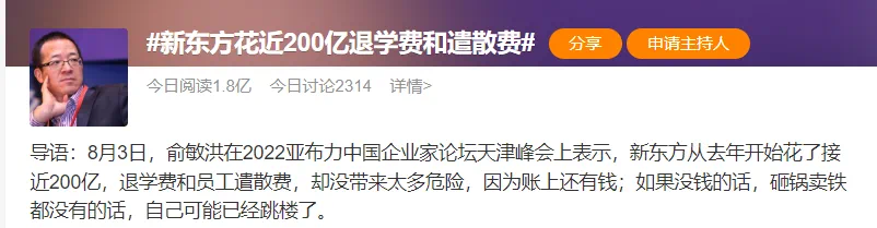 在後來的股東交流會上,俞敏洪説,他試圖調節兩邊的問題,討好兩邊粉絲。“我常出鏡,一會兒到與輝同行,一會兒到東方甄選,但(水)沒端平,最後火燒到自己頭上。”