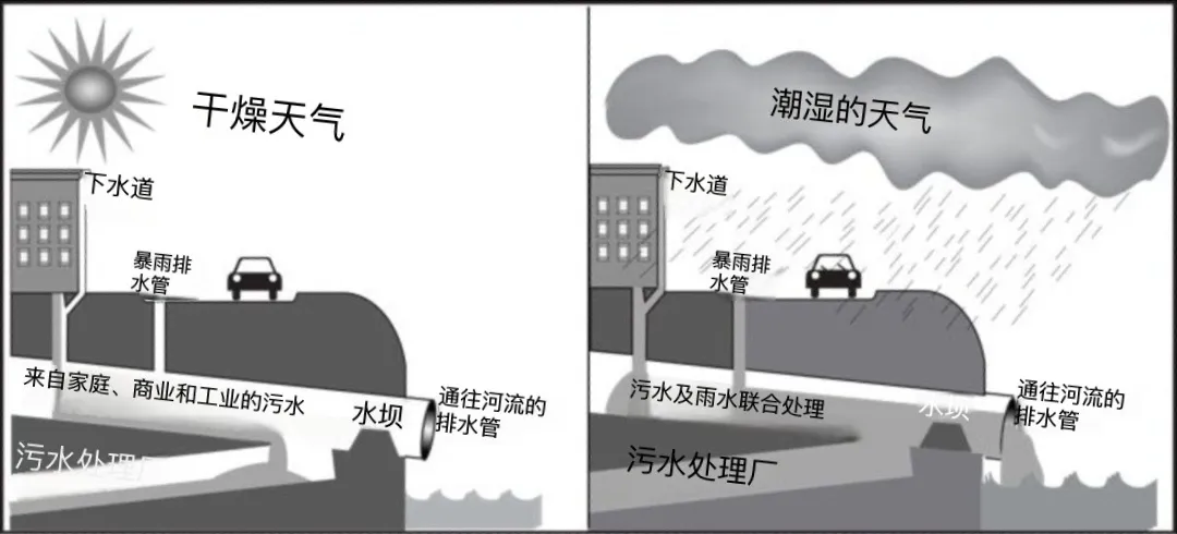 合流制排水系統的工作原理|圖源:Wikipedia commons