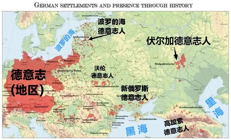 ▲德意志本土及俄國境內德意志人分佈(紅色)