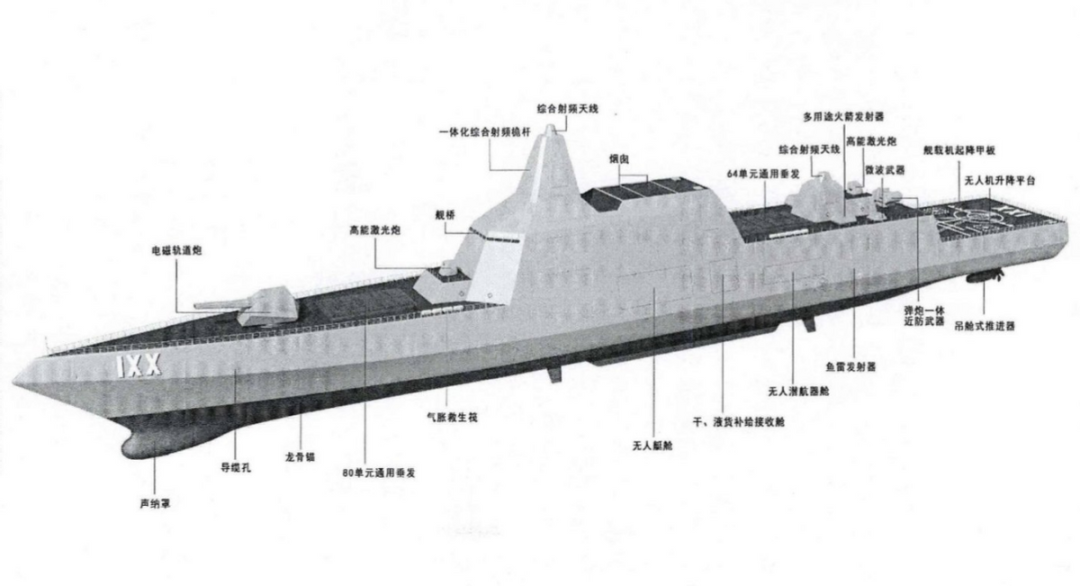 以電磁軌道炮,高能激光炮,微波武器組成的新概念武器、以無人機、無人水下潛航器組成的無人機裝備、綜合射頻技術集成桅杆、集成一體化上層建築、可遂行防空反導、反潛反艦、對陸打擊等任務,具備大型化、通用化、標準化、多功能化、集成化及隱身化等特點,不論是看起來還是聽起來,給人感覺還蠻不錯。