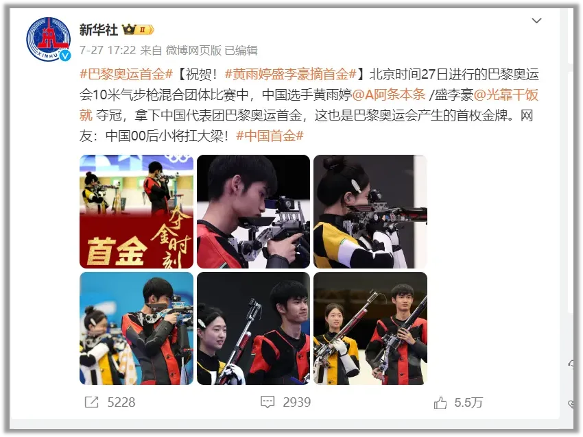 這次奧運會第一塊金牌,是由射擊運動員盛李豪、黃雨婷拿到的。然後一般這種奪冠了,各大官媒不是都會把運動員@出來,祝賀他們奪冠嗎。