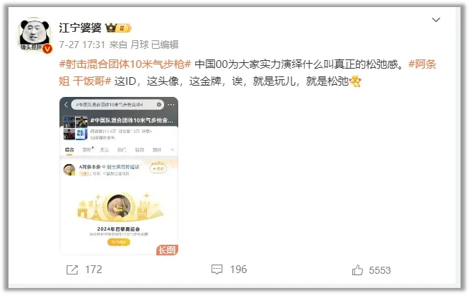 盛李豪光靠乾飯就摘得巴黎奧運會射擊混合團體10米氣步槍金牌!