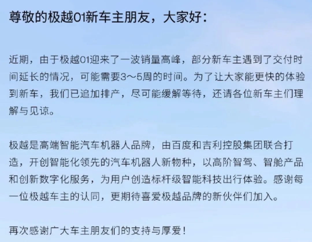 2024年7月下旬,極越官方發佈公告稱,極越01近期迎來一波銷量高峯,部分新車主可能面臨3-5周的交付時間延長。