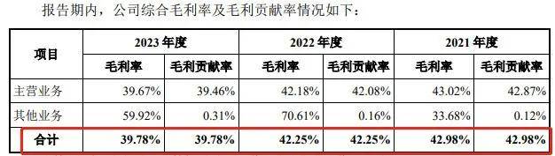 招股書顯示,2021年-2023年(以下簡稱“報告期”),珂瑪科技的綜合毛利率分別為42.98%、42.25%和39.78%,逐年下降。