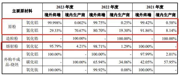 截至2023年末,珂瑪科技氧化鋁原粉99.998%的供應來自境外終端,氮化鋁原粉境外終端的供應下降,由2021年的91.86%降至2023年的29.33%;氧化釔熔射粉境外終端供應也出現下降,從100%降到95.79%,但佔比依然較高。