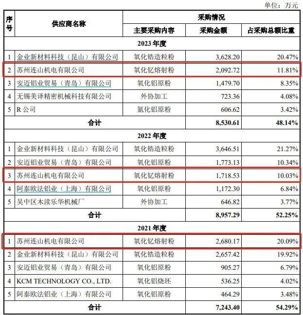 但報告期內,公司向供應商蘇州連山機電有限公司採購氧化釔熔射粉的金額就達到2680.17萬元、1718.53萬元和2092.72萬元,佔比分別為20.09%、10.03%和11.81%。