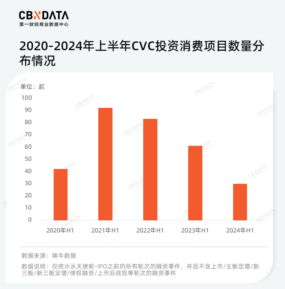 值得一提的是,曾經大爆發的CVC投資模式開始走弱。“商而優則投”, 過去越來越多品牌、平台、上下游產業端以及與消費毫不相關的CVC轉身做起消費投資。而隨着市場低迷,CVC的“餘糧”也不多了,不止投資項目數量減少,大額投資(投資金額超1億)更是從去年上半年的13起下降到了今年上半年的5起。