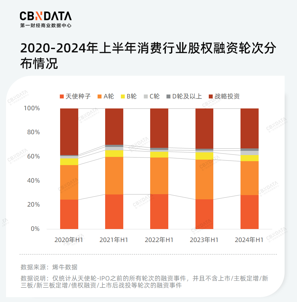 為了規避風險,消費投資人青睞“投早投小”。近5年上半年度,初創期(天使種子輪以及A輪)項目牢牢地佔據大頭,其中2024年上半年天使種子輪的佔比更是接近30%。當然,成熟的企業也有機會。烯牛數據顯示,處於成長期 (B輪及C輪)的獲投企業佔比有小幅上漲,例如滬上阿姨、AMIRO等比較成熟的品牌均在今年獲得了融資。此外,公司創業投資或戰略投資保持活躍,戰略投資佔比有所增加。
