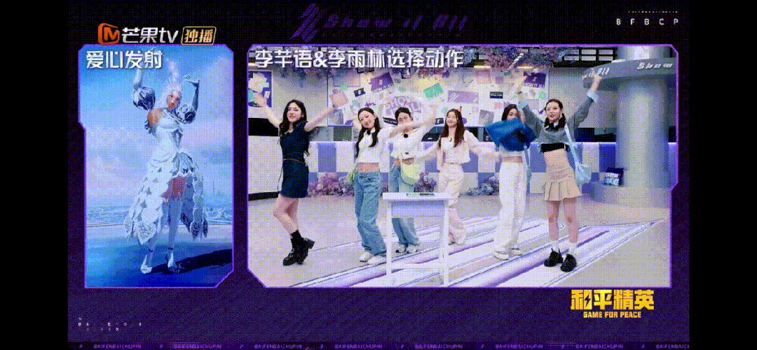 更有趣的是,在《百分百出品》節目的路演環節和第二現場,R.E.D成員們實況還原了遊戲裏的“空投舞”、“比心舞”等高人氣玩家動作。當這些玩家們再熟悉不過的遊戲動作,用女團的專業形態呈現出來,怎麼不算親切呢?畢竟,誰沒在“戰鬥開始前”在《和平精英》大廳裏和搭子們“鬥過舞”呢?