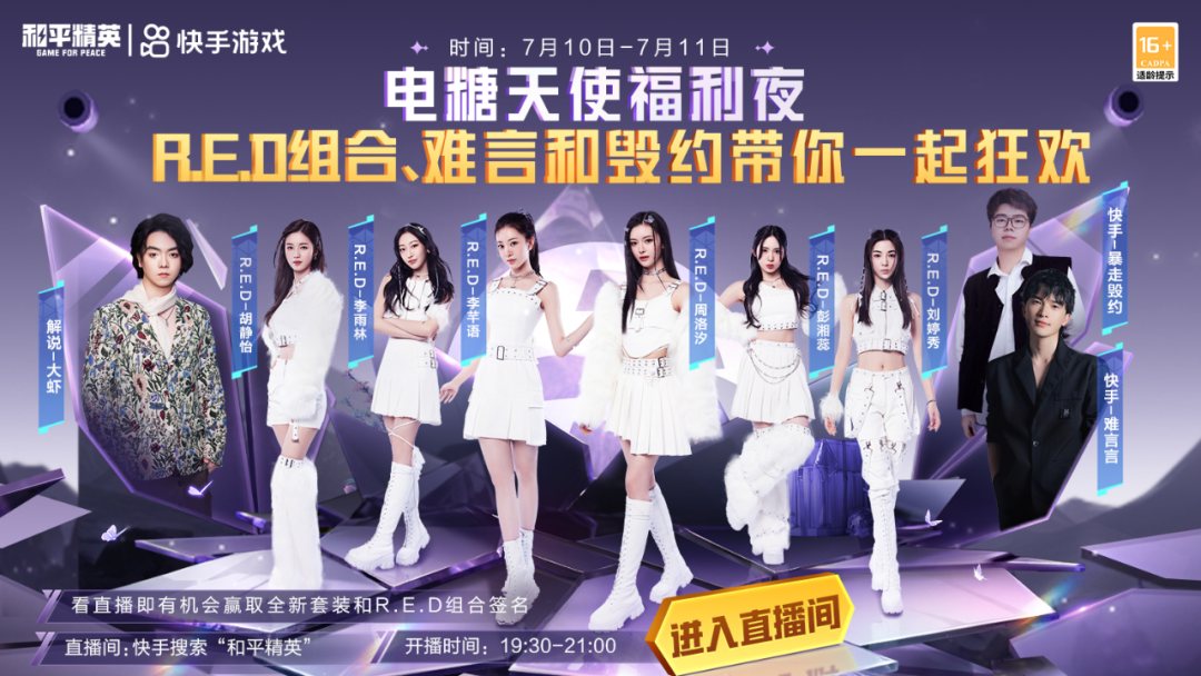 “電糖天使”上線當天,也即R.E.D正式出道日,《和平精英》攜手R.E.D女團、知名遊戲主播一起開啓線上福利夜直播活動,真人女團身穿“電糖天使”同款COS服進行直播,一起為玩家送福利。明星粉絲與玩家同屏共振,連續2小時直播遊戲榜Top1,單場互動量超2200萬。