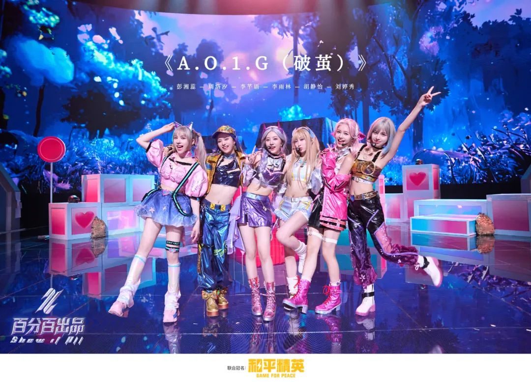 《百分百出品》的終極舞台中,在女團妝造上極具特色,舞台更因《和平精英》具有未來感視效融入,排面拉滿。電音潮流的主視覺效果,是《和平精英》女團內容的“熟悉的味道”,搭配上六款輕賽博風格的虛擬形象、六款各具特色的標誌性水晶羽翼、與六個性格迥異的人物小傳,在六位女團成員的舞台cos演繹下,帶來令人深刻的視覺震撼。