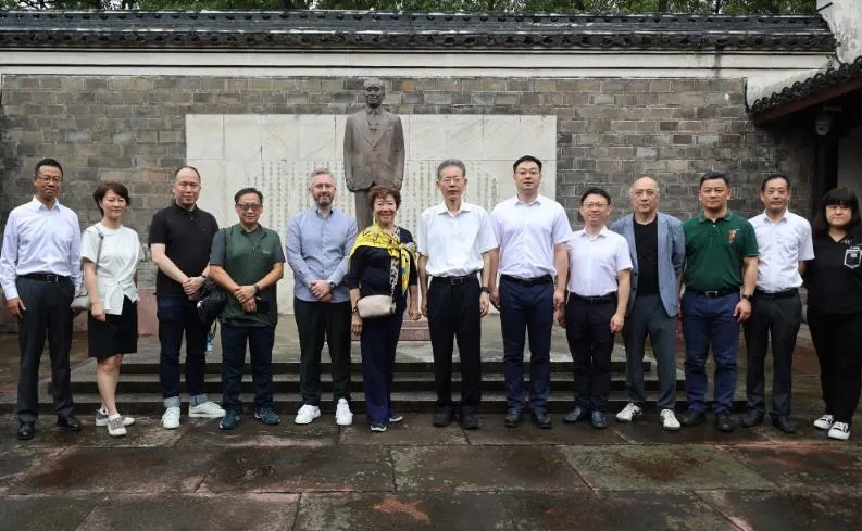 包陪慶(左6)在鎮海包玉剛故居的祖父包兆龍雕像前合影,圖源中國寧波網