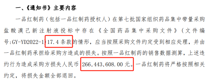 日前,一品紅髮布公告稱,公司旗下全資子公司廣州一品紅製藥有限公司於近日收到國家組織藥品聯合採購辦公室的違約通知書。通知顯示,在第七批國採鹽酸溴己新注射液投標中,一品紅製藥存在《全國藥品集中採購文件》17.4條款情形。按照一品紅製藥的銷售數據測算,相關違約行為造成採購方損失人民幣2.66億元。一品紅製藥將嚴格按照相關約定,將損失金額全部退回。