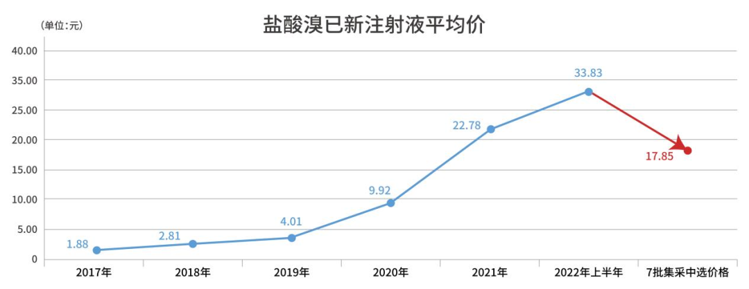 2020年時,鹽酸溴己新制劑平均價格為9.92元/支;到了2022年上半年,這一數字一度上衝至33.83元/支;直到2022年7月,第七批國採後,才遏制住這款祛痰老藥的價格。
