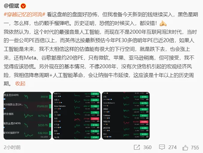 東方港灣董事長但斌微博發文稱,“看這盤前的盤面好恐怖,但我準備今天新到的錢繼續買入,黑色星期一,怎麼樣,也扔顆手榴彈吧。歷史證明,恐慌的時候買入,都沒錯!”
